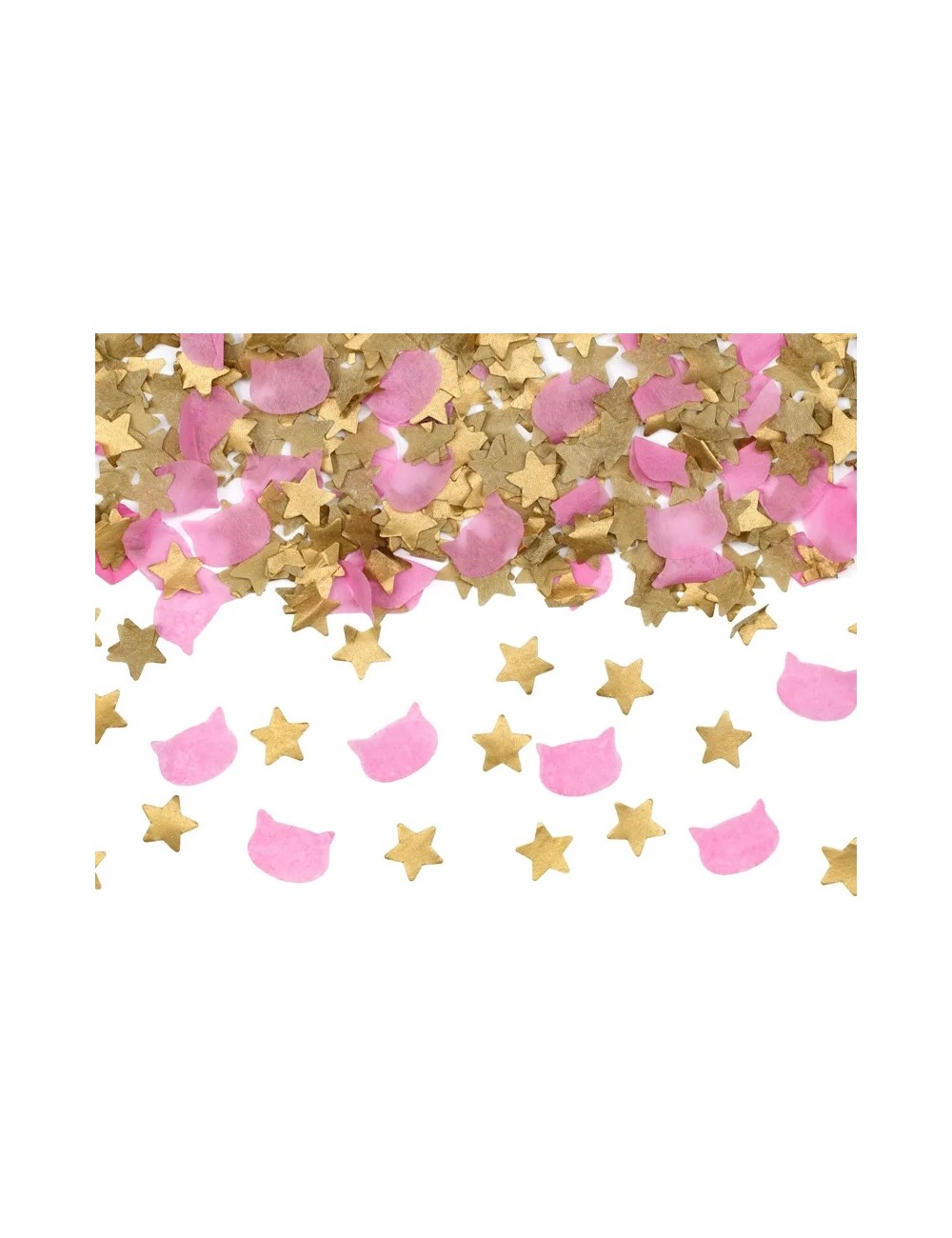 Confettikanon met roze poezen en gouden sterren in het thema "Meow".