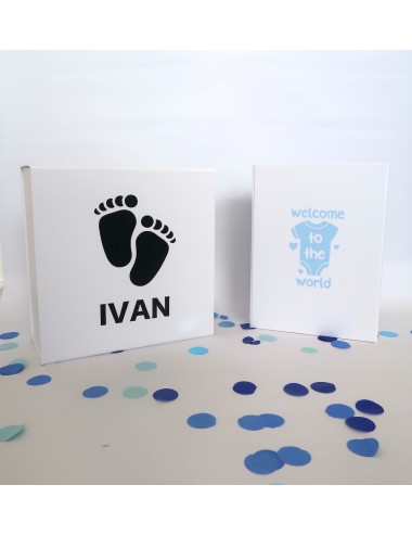 Deze cadeaubox is bedrukt met voetjes en is perfect om jouw cadeau in te geven. De kleur is aan te passen is het mogelijk om nog een naam of andere tekst toe te voegen aan zowel de buitenkant als binnenkant (bijvoorbeeld geboortedatum). De box is te bestellen als brievenbuscadeaubox of als luxe geschenkverpakking. Op de afbeelding is een luxe geschenkverpakking afgebeeld (Maat XL) met mat zwarte opdruk.