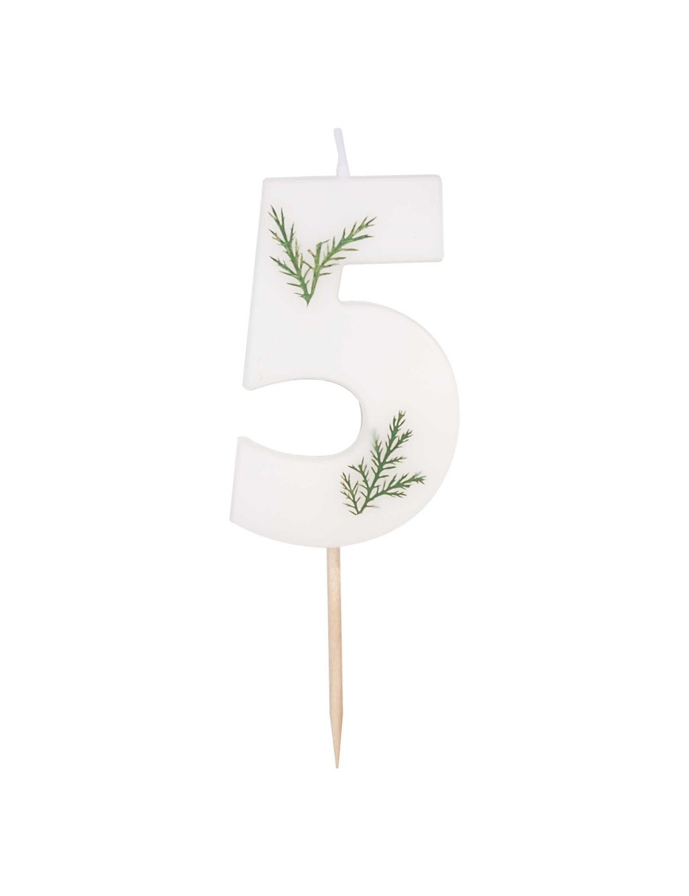 Witte cijferkaars met blad. Een verpakking bevat 1 cijfer