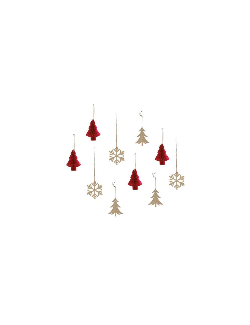 Maak de kersttafel extra bijzonder met deze kerstversieringen. Een verpakking bevat: 3 x houten kerstbomen, 3 x houten sneeuwvlokken, 4 x rode honeycomb bomen en 5 meter jutetouw.